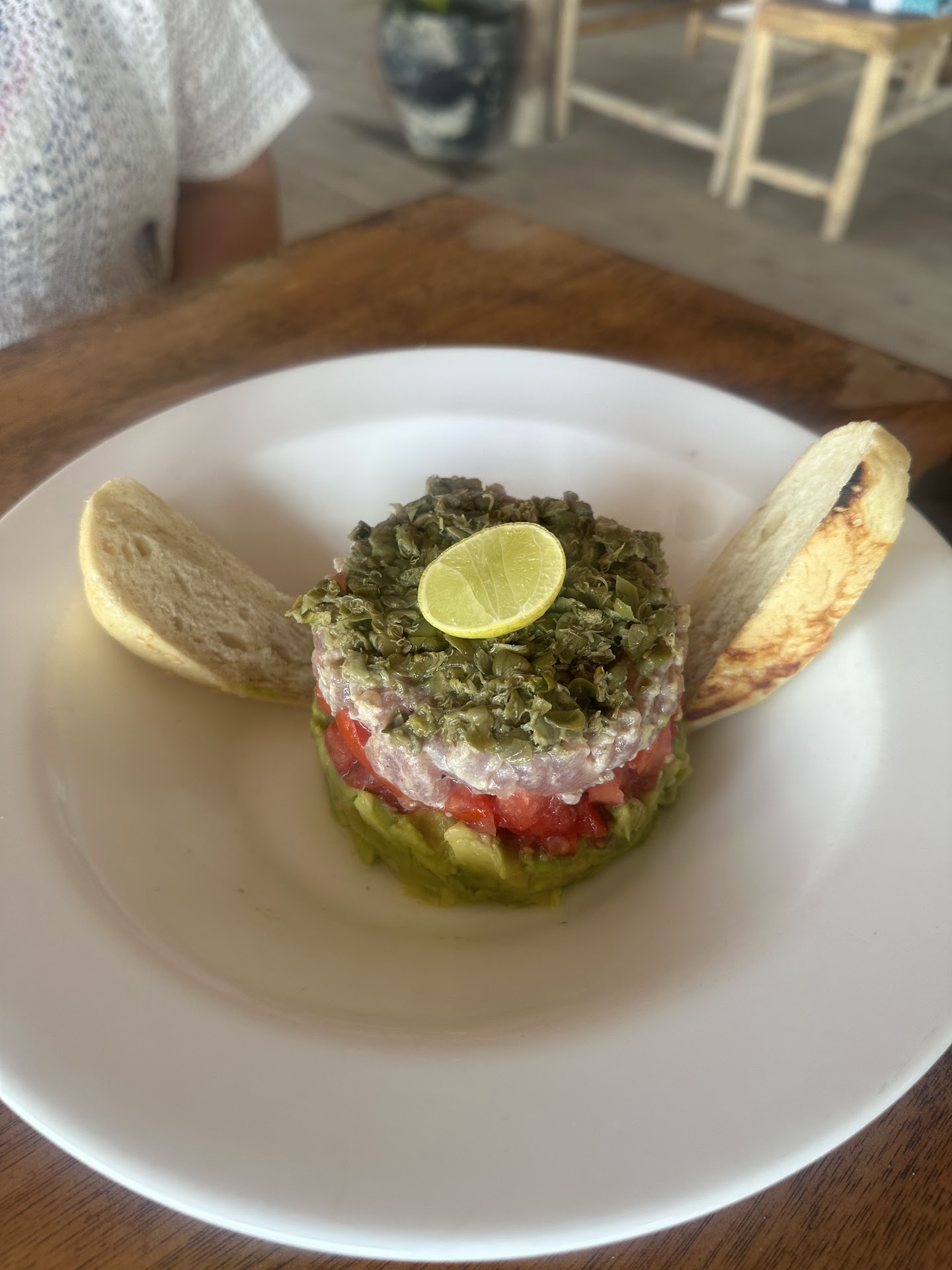 The decor is simple but very beachy and cozy, with all the essentials like fans, power outlets, and even a dartboard. They also have a cocktail happy hour from 5 to 7 PM, where you get a free cocktail if you buy two. The cocktails are nicely strong (not watery like you can get at some touristy places), and the juices are fresh and tasty.