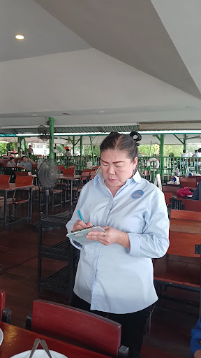 ร้านอยู่ริมน้ำ บรรยากาศคล้ายนั่งบนแพ ด้านข้างเปิดโล่ง วิวสวยงาม