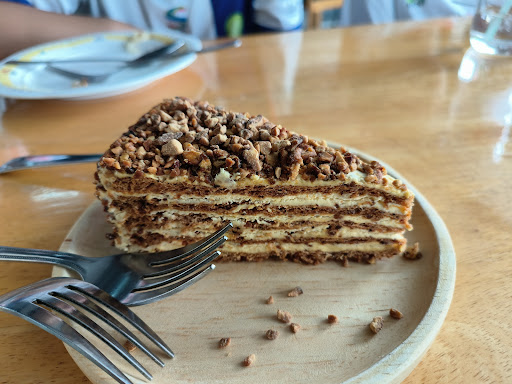 เค้กไร้แป้ง (แต่คิดว่าคงมีน้ำตาล) ตอนตัดลงไปดูแข็งๆ แต่ตอนเคี้ยว ก็ไม่ได้แข็ง อร่อยเลย ต้องลองๆ