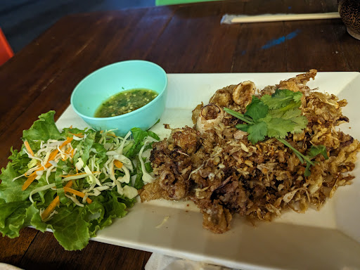 Has a cute little corner, not too busy. Unfortunately, for some reason, there are cops on the street blowing whistles to direct single cars which drive down the intersection. Very annoying. I asked if they had Thai iced tea. Our waiter said yes and quickly brought an iced lipton bottle. It was glass, with rust on the lip. I verified that I asked for a Thai iced tea. He said he would bring a second tea for the other guest at my table. We communicated we did not want a second, but that we wanted a thai iced tea with condensed milk. He shrugged and said that was the only one he could give me. I didn't touch it and they still charged us 100 baht for it. The food was okay, lots of grease. Spring rolls' outside were crispy. Unfortunately, the long bits of cabbage and greens inside made it hard to eat as they got stuck in your teeth and tended to pull the entire inside out. Overall,...