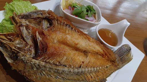 ปลากระพงทอดน้ำปลา 🐟 ตัวไม่ใหญ่มากไซส์ประมาณ 1 กก. +/- ทอดออกมาได้กรอบดี ตัวซอสน้ำปลาที่ราดเค็มๆ หวานๆ อร่อยดี ไม่เหม็นคาวน้ำปลา ถือว่าดี ส่วนน้ำยำมะม่วงสำหรับเรารสแปลกไปนิด ไม่แน่ใจว่าเพราะมีกลิ่นแครอทขูดฝอยในน้ำยำรึเปล่า? ส่วนตัวชอบกินปลาทอดกับน้ำจิ้มซีฟู๊ดเลยสั่งมาด้วย น้ำจิ้มซีฟู๊ดติดหวานไปนิด กลิ่นมะนาวสดน้อยไปหน่อยนึง แต่เผ็ดกลางใช้ได้