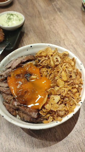 " Wagyu Fried Rice Bowl " 💰 : 290THB หอมมมมมมโชยมาเลยจานนี้ กับข้าวเนื้อนุ่มหนึบที่ผัดมาด้วยมันเนื้อวากิว จนได้เป็นข้าวผัดที่มีกลิ่นหอมของเนื้ออย่างเป็นเอกลักษณ์ เสริมรสสัมผัสด้วยเนื้อทาจิมะวากิวที่เสิร์ฟมาให้ฟินกันสองแบบ ส่วนเนื้อนุ่มๆที่ย่างบนเตาถ่านจนหอมก่อนเสิร์ฟท๊อปไว้ด้านบนและส่วนเนื้อติดมันหนึบๆที่ผัดมากับข้าวผัด เสริมความละมุนและรสชาติด้วยไข่แดงดอง แฝงด้วยกลิ่นอายญี่ปุ่นด้วยน้ำจิ้มแจ่ววาซาบิ