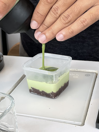 Matcha Anko Panna Cotta - เมื่อสั่งเจ้าของจะเติมซอสชาเขียวด้านบน ด้านบนซอสจะมีรสชาเขียวข้นผสมความหวาน ตรงกลางเป็นแพนนาคอตต้าชาเขียวแบบไม่เข้ม และปิดท้ายล่างสุดด้วยถั่วแดง ส่วนตัวเราว่าออกทางหวานมากไปหน่อย ชั้นชาเขียวตรงกลางควรเข้มขม เพื่อตัดกับถั่วแดงหวานด้านล่าง แต่อีกคนบอกว่ากำลังดี แล้วแต่ชอบ