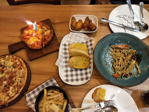 [รสชาติและคุณภาพ] 😋 ** รสชาติของพิซซ่าแป้งบางกรอบ 🍕 กรอบจริง ไม่เลี่ยน หน้าที่เราเลือกก็ถูกใจเป็นอย่างมาก😋 อร่อยมากๆ กินหมดถาดเลยคะ ** รสชาติของสปาเก๊ตตี้ ♨ จานนี้ก็ฟาดเรียบเหมือนกัน รสชาติดี จัดจ้านและเข้มข้น ได้กลิ่นหอมของเครื่องเทศ 😋 รสชาติเผ็ดจริงๆ มีกระเพรากรอบไว้กินตัดเลี่ยน ** รสชาติของปีกไก่ทอดบาร์บีคิว🐔 เนื้อไก่นุ่ม ซอสบาร์บีคิวเข้มข้น 😋 หอมและอร่อย ** ขนมปังกระเทียม🍞 พอได้ 🔥 แต่ต้องกินตอนกรอบๆ นะ ** พิซซ่าแป้งหนานุ่มหน้าฮาวายเอี้ยน แป้งหนานุ่มจริง ไม่เลี่ยนเพราะมีสับปะรด🍍 ตัดเลี่ยน ทำให้โอเครเลยสำหรับหน้านี้ แต่ทานไม่หมด 🏡 ใส่กล่องกลับบ้าน ** เฟรนฟรายส์ชีส ต้องกินตอนร้อนๆ นะ ถึงจะอร่อย ราดซอสมะเขือเทศหน่อย แก้เลี่ยนได้ดี ** โค้กในเซ็ท 3 แก้ว ตอนนี้ยกเลิกเป็ปซี่รีฟิลแล้วนะคะ มีแต่โค้กนะคะ 3 แก้วกำลังพอดี ไม่มากไม่น้อยเกินไป