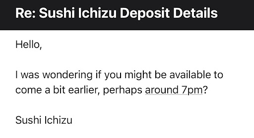 予約は19:45だったが、当日の16時前になって「19:00に来られるか」というメールが届く(画像の通り)。敬称はなし。文面も、いわゆる客に対するもてなしやマナーが感じられるものではなかった。