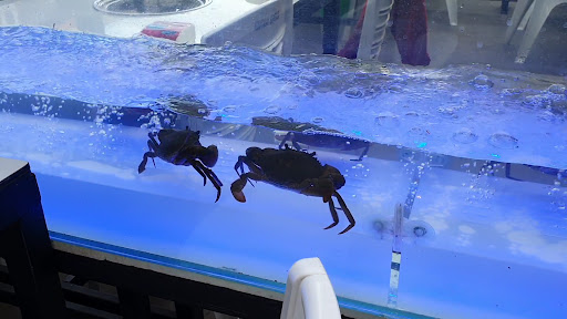 There are tanks with live crabs and prawns next to the tables. You can use a tong to pick them up and grill them on your table.