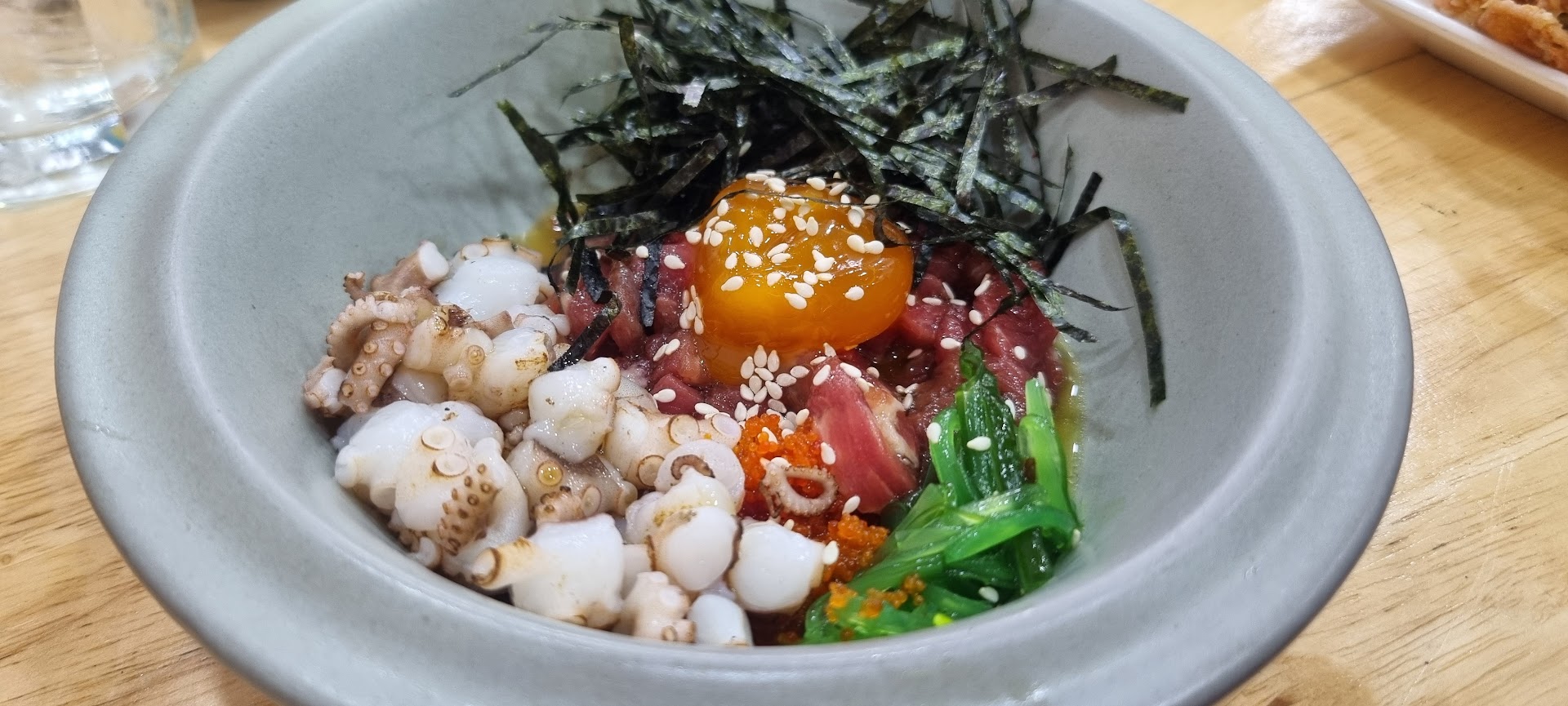 ปลาหมึกกล้วยซาซิมิ ขุ่นมาเลย ไม่กรอบ ไม่ใส ตัวเล็กจนสงสาร ไม่มีหนวดมาด้วย เรียกพนง.ว่านี่ปลาหมึกเป็นๆจริงหรอ พนักงานบอก “ค่ะ”