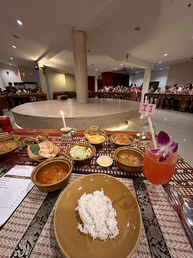On nous emmène ici pour un soit disant restaurant spectacle. Je m attendais à un lieu décoré et un spectacle de professionnel où les thailandais peuvent aussi venir . Le choc on se retrouve dans un genre de salle des fêtes, aucun décor de spectacle, aucune ambiance , c est glauque. Seuls les musiciens ont l air professionnel. Le reste , des jeunes qui défilent pour nous montrer leur spectacle comme une jeunesse et le spectacle de fin d année. On est nous seuls dans la salle alors qu on s attendait à s immerger un peu dans la vie nocturne de Bangkok en allant voir un spectacle !!