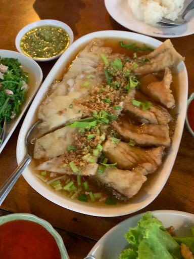 We were quite hungry, so we ordered a variety of dishes: ต้มโคล้งปลา (fish curry soup), เป็ดทอด (fried duck), Lad-Nah with fried noodles, and a Fish and Veggie Salad.