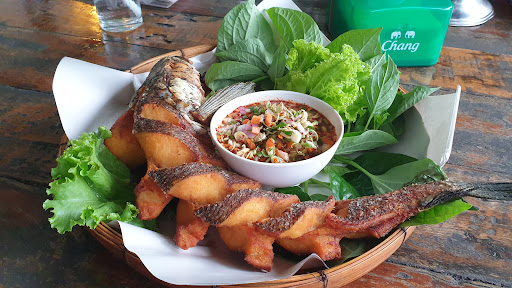 ปลากระพงทอดราดน้ำปลา 280 บาท ปลาตัวใหญ่ สด ทอดมากรอบ น้ำปลาที่ราดมาออกเค็มหวาน มีน้ำยำมะม่วง เนื้อปูหลนผักสด หลนใส่เนื้อปู เสิร์ฟพร้อมผักหลายชนิดดึ ครบเครื่อง 120 บาท ต้มยำกุ้งมะพร้าวอ่อน เป็นแบบต้มยำน้ำข้น ใช้กุ้งเป็นน้ำต้มยำครบเครื่องสมุนไพร ซดคล่องคอ 200 บาท -ทอดมันกุ้ง ทอดมันกุ้งเหนียว นุ่ม อร่อยดี 120 บาท