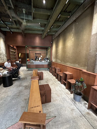 The café’s interior is thoughtfully designed, featuring earthy tones, raw concrete walls, and polished wood, creating a timeless and cozy ambiance. The space is both stylish and comfortable, making it an ideal spot to relax, work, or enjoy a conversation over a cup of coffee.
