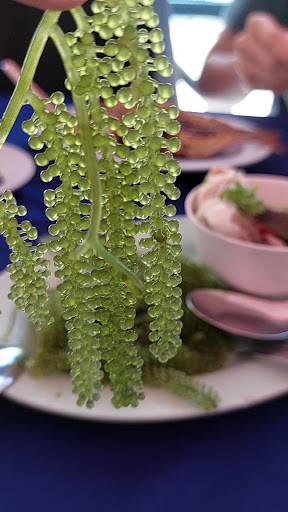 Sea grapes. Heard of this but never tested this before. Briny sweet little sacs of juices that pops in your mouth. It's so fresh, paired with a side of calamari and fish salad. Good harmony of flavours.
