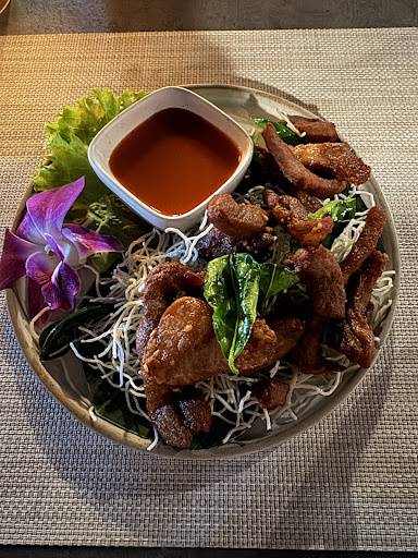 What a place. We booked a boat ride that took us to this restaurant. You can reach it by car also but taking a boat ride was nice. The restaurant has water access and it overlooks the river and it is a nice view. I liked the sunset view. It's beautiful and modern looking inside, with different rooms. I came on a tour and so the dishes were picked by the tour guide. I was told I was eating traditional Thai food. The food was delicious. I liked everything I tried. I really liked the pumpkin dessert. It was good and different. For me, this was one of the best restaurant experiences for me in Thailand. The service at excellent and friendly. The restaurant was beautiful inside. This place was great. I liked the nice, chill but romantic atmosphere around. I...