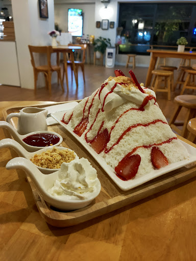 Very nice Bingsu here and a nice range of flavours to choose from. Plenty of toppings with it. This Bingsu was eaten by two people. Drink was Earl Grey tea with milk and comes with pieces of jelly which is very nice. Last orders taken at 7:30 but open until 8:00 and parking is to the side of the cafe also. There is a bathroom although you should ask for directions from the staff because it is in a separate building outside the restaurant...