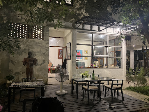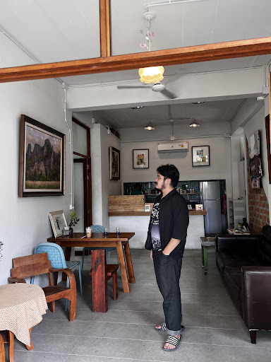 P.S. องค์ประกอบสิ่งแวดล้อมด้วยความสงบเงียบไม่วุ่่นวาย ห่างไกลจากเสียงรถราครับ ช่วยให้มีสมาธิจดจ่ออยู่กับการนั่งทำงาน การอ่านหนังสืออย่างมีประสิทธิภาพ โดยเฉพาะอย่างยิ่งงานศิลป์ภาพวาด รูปปั้น และ Art Work ต่าง ๆ เป็นแรงบันดาลใจในการสร้างสรรค์ผลงาน อีกทั้งยังช่วยสร้างความสมดุลทางอารมณ์และจิตใจเป็นอย่างดี เมื่อร่างกายจิตใจเกิดความตึงเครียดจากการทำงานหรือการอ่านหนังสือแล้ว พักเดินชมงานศิลป์ช่วยฟื้นฟูปรับสภาพจิตใจได้อย่างมากครับ รวมทั้งสินค้าของที่ระลึกเรียบง่าย; กระเป๋า เสื้อยืด การ์ดภาพ ที่มีลายเรียบง่าย ลายเส้นเป็นเอกลักษณ์ของร้าน มองดู เห็นแล้วรู้สึกเยียวยาจิตใจแบบบอกไม่ถูกครับ สัมผัสถึงความอบอุ่นของงานศิลป์ครับ อยากได้กระเป๋าสะพายข้างสักใบ และเสื้อเก็บไว้สักตัว ฝากโอกาสหน้าไว้เตรียมงบมาครับ บรรยากาศโดยรวมฟื้นฟูจิตใจดีมากครับ Just notice all the good things of the place....