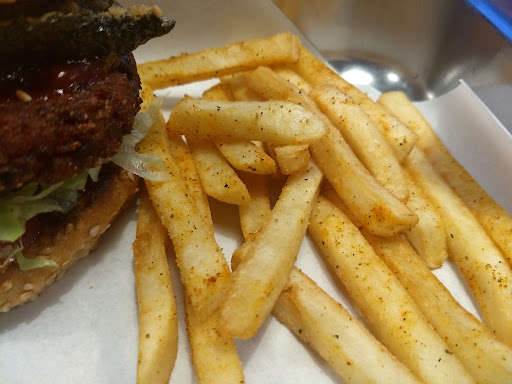 Read moreSo I've been looking forward to this veggie burger for a week. A week of fasting. This burger is on several best veggie Berger list of Chiang Mai. And I'm going to tear into it. Like a rabid rabbit. So presentation. 10 out of 10. Looks exactly like the picture perfect burger. And it's served that way. I was impressed. Now what about what's on it. It comes stacked from the bottom shredded ice Berg lettuce, tomatoes, bean beet based Patty, sauce and two breaded deep fried seaweed strips. And of course the seasame seed bun. Now how does it taste. Pretty good. It doesn't blow me away. But it's really decent. The seaweed I thought would overpower the taste, but it doesn't. It gives a nice crunch, and only a slight after taste if you pay attention. The party itself actually has a nice char, and beets give it a good color, but even though it has a crispy outer char it's still a bit too mushy. And makes for somewhat precarious eating. As for the sides. I got the included straight up french fries. And they were really good and seasoned well. My only complaint here would be for 180 baht. I'd like to see double the amount. But I can't get everything. Extra fries also have a heavy price tag of 90 to 150 bhat. So I feel like this burger rates up on scale of all time veggie burgers I've had. On that scale I'm going give in a 7.5. I'd give it a 8 with more fries. I'd say other places I've had here rank 8 to 9. None...