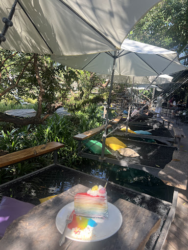 Jungle De Cafe in Baan Tawai offers a serene escape with its beautiful scenery and tranquil vibe. The outdoor seating area is surrounded by lush greenery, featuring life-sized buffalo statues adorned with marigold garlands, adding a unique touch to the ambiance. A cascading waterfall in the background creates a refreshing atmosphere, while the picturesque view of the rice fields and bamboo pathways provides a truly relaxing experience.
