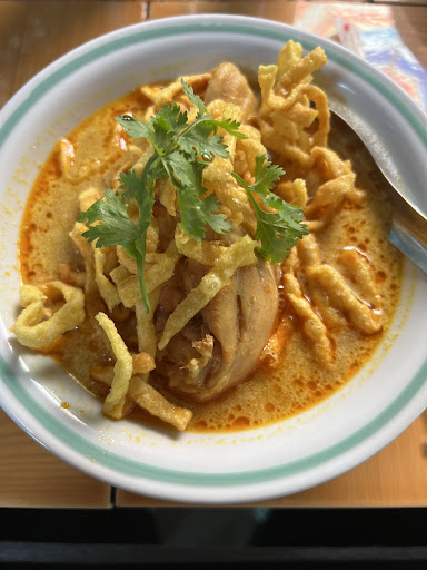 Read moreThis lovely little mom and pop restaurant is just around the corner from my hotel, BED Phrasingh (highly recommend for young, child free travelers not on a tight budget) and I wanted one more sweet taste of khao soi before I left Chiang Mai. The chicken drumstick in the bowl was so tender I could eat it with chopsticks! The noodles on top were perfectly fried, the noodles in the soup were tender but still had a bit of chew, and the broth was perfectly spiced, if not seasoned. I added some sugar to mine but I like my khao soi a bit sweeter. Luckily there were seasonings on the table so I could adjust it myself. The people who ran the place were really nice and made me a Thai iced milk tea to go with my soup. They also had a very nice cat, which earns them bonus points...