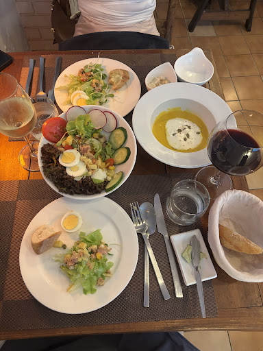 We started our dinner with a beautiful glass of wine — because in a French restaurant, it’s always wine o’clock! 🥂 The fresh salads were vibrant and full of flavor, perfectly paired with crusty French bread and creamy pumpkin soup that was out of this world.