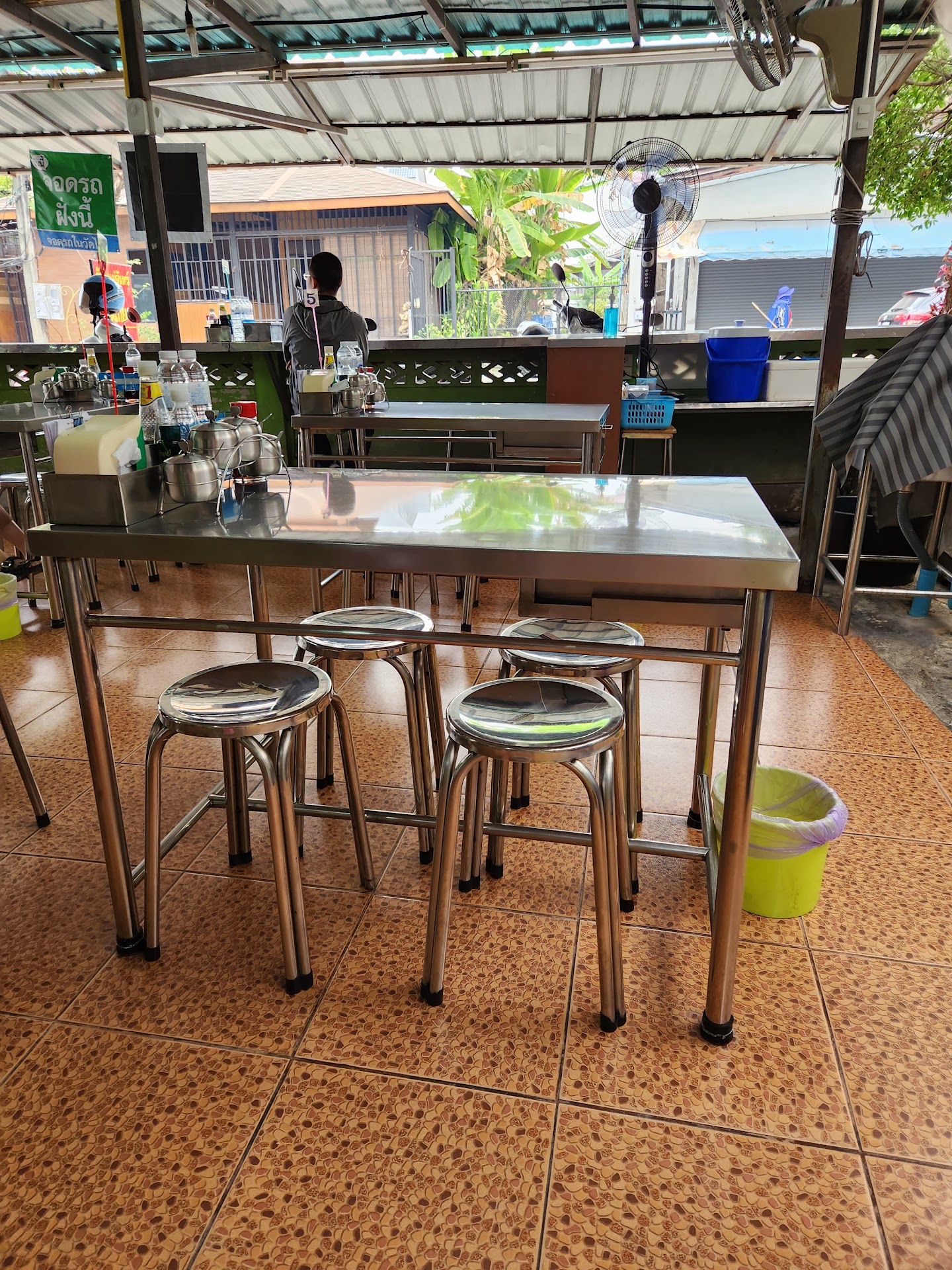 I ate outside under the awning. The tables and stools are stainless steel. The stools were a good height and not too low! There is a drawer at the end of each table filled with stainless steel forks, spoons, and chopsticks.