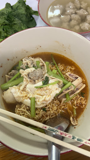 เครื่องจัดเต็ม: ผักกวางตุ้ง ไข่ ลูกชิ้น หมูสับ ปลาหมึก (เป็นเหมือนปลาหมึกแห้งแช่น้ำให้คืนทรง)