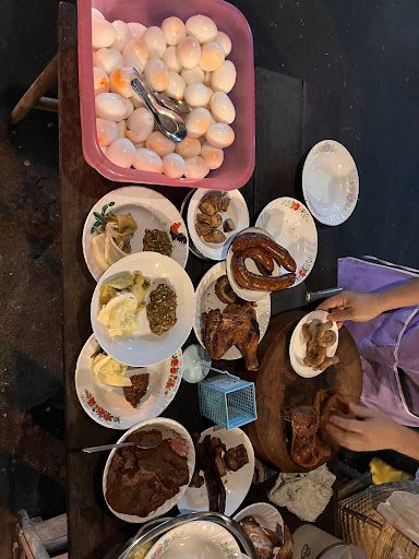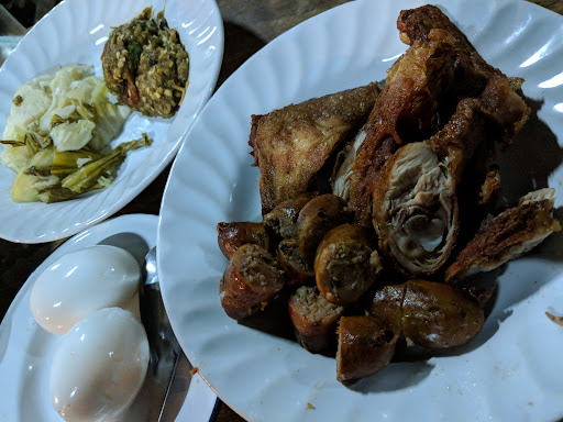 Tasty late night meal of super crispy chicken, sausage, crispy pork and sticky rice. The Nam Prik Noom (Green chilli dip) and cabbage that came with was my favorite part but the meat had good flavor too. It’s a simple menu and they let us know right away that they don’t have an English menu (they don’t even have a sign with English except for the Facebook site that says midnight/stickyrice.) There is a yellow sign with a chicken on it so we decided to chance that this was correct despite the map being a little off. We aren’t picky so the lack of menu was remedied by asking for the usual order and she suggested the three meat plates and asked if we wanted sticky rice. They also had boiled eggs available but we didn’t try them I later read they may be duck eggs and I’m sorry we didn’t try it. The night we were there there were only a couple other English speakers and the place was packed. There was also a mango sticky rice nearby that I didn’t see on the map but it is fantastic and comes with a baggy of super creamy coconut cream for take away. They had repeat customers standing in line telling us how good it is...