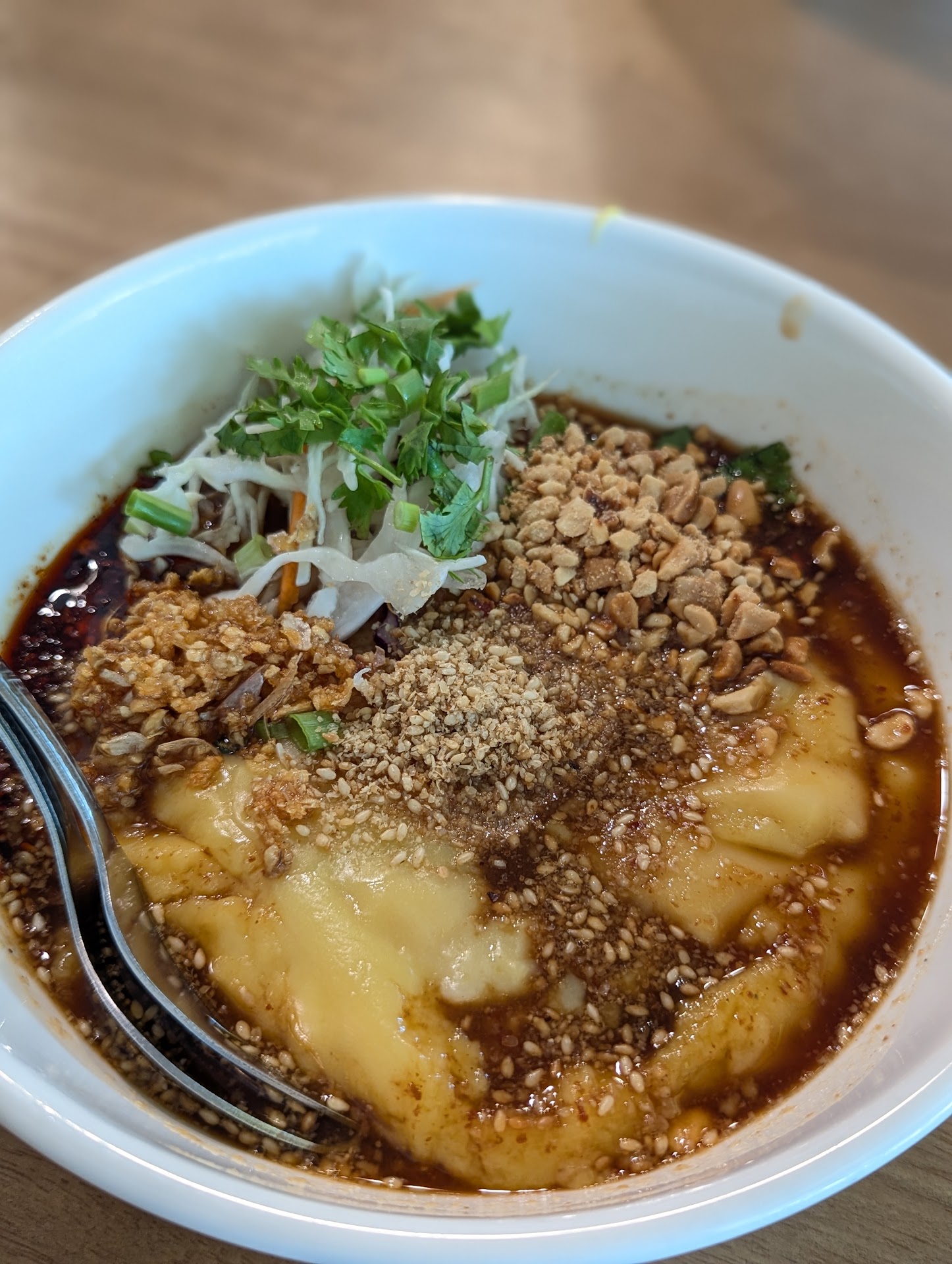The silky, soft rice noodles come drenched in a rich, velvety soup made primarily from yellow beans—imagine a savory, rich soybean milk, perfectly thick and flavorful. Topped generously with crispy garlic bits, spicy chili oil, crunchy crushed peanuts, and fresh cilantro, every spoonful was an exciting burst of flavors and textures. It's gently sweet, subtly spicy, incredibly aromatic, and truly heartwarming—total comfort food!