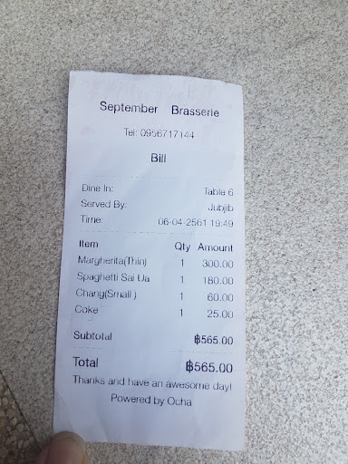 Read moreAfter two and half years on the road, we know that when we really crave for pizza, there are times that we will be disappointed. We did our due diligence and dud our research and September Brasserie had very good reviews for their pizza. To us it was a complete disappointment. The pizza at first sight, looks very good, thin crust and a nice outer crust (thanks to the wood fire oven cooking) but: it had way too much mozzarella cheese on it (and not of the best quality!) and the cheese was undercooked. the bottom of the pizza (especialky in the center) was gluey (probably due to the fact that their oven was not hot enough) and it could not support the weight of the cheese. the pizza is large but because of the above, I only ate the outer part where there was less cheese and where the crust was more edible. At 300 baht for a simple margherita pizza we found it very expensive when you can have the same pizza, in the old town at 40% less than...