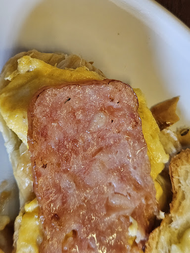 A croissant with bacon, cheese, and egg costs 155 baht. At this price point, I would have expected real crispy bacon, not processed Thai salami/bacon. Added pictures. On the menu, they are showing real bacon.