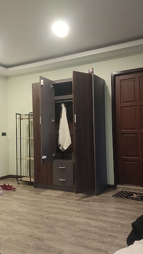 Family room is huge, there is at least 10ft from end of bed to wall. A wardrobe, huge samsung Android TV, dressing table, shelves, side table. Bed is super comfy, towels, soap & shampoo provided. There is a balcony too.
