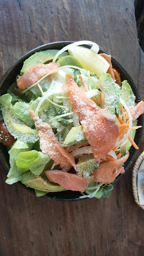 Ordered a salmon and avocado salad for breakfast. Looked like a generous portion but it was deceivingly just loads of leaves, the occasional cooked salmon pieces (disappointingly not smoked salmon), semi bruised avocado and a dusting of horrid smelly cheese. Cost 220 baht (£4.91) which is very expensive for a dish that is 90% leaves. The guy saw I had not eaten the leaves and asked if it was ok. I told him I was unhappy with it, it was a lot of money for mostly leaves, he offered to add more salmons and I refused because the fish didn't taste that good and I didn't want more food. Would've been better to have had a (partial?) refund or a free drink. Ordered mocha and it was horrid. Also noisy as it is on the main road. Do not...