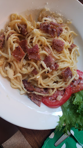 The Carbonara with Bacon was not very good, the sauce was creamy, but it had a sweet flavor as if it was cooked with condensed sweetened milk or something? Most carbonaras I've had in Thailand are salty or cheesy, but I was not expecting the sweet flavor. We ordered 3 dishes between 2 people and after the 1st plate (a sandwich) came out, it took like another 10 minutes for the 2nd dish (pasta). Then, another 10 minutes passed before we were informed that they couldn't make the 3rd dish (pigs in a blanket appetizer) because of some missing ingredients, but it was weird to find out more than 20 minutes after having ordered it, like they were not even going to start preparing it until after we were done with the...