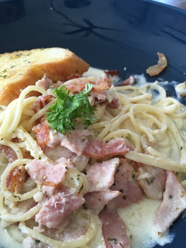 สปาเกตตี่คาโบนาร่ารสชาติออกหวานๆนิดๆเครื่องเยอะดี น่าจะเป็นอาหารอร่อยที่สุดในวันนี้แล้ว