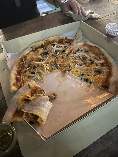 The other day we’re sitting at the Mexican next-door to this place and we decided to order pizza and since my friend is vegetarian she ordered the vegetarian pizza and it was tasty very good but the crust was so thin that you barely hold a pizza toppings on it!