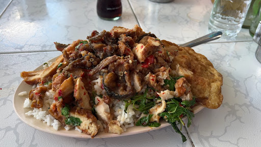 A TikTok clip caught my attention! The "Wow" 😮 size of the food on the plate! And the food looks yummy 😋 too. So, off I go to quench my curiosity 😁😉. What you see on every photos is what you get , it's real, guys! Super big plate with mountain of rice and the food is spilling out of your plate! The overall taste is more like a home cook food. Tasty even for foreigners taste bud. If you are heavy on the spiciness request for it. The price is cheaper than at any food court. But for me the touching part of this visit is not so much about the food, it's about the " beautiful ❤️ heart" of the stall owner! I was oozing with curiosity, why he served such big portion at a much lower price. He answered me with a compassionate look, saying, he wants to give ANYONE that needed a full stomach for the day to come and he will fill them! 😢😭 as times are pretty tough now in Thailand!! Hear that! I left this stall feeling "full in my spirit" not just my stomach! If you want to top up your stomach 😉 and at the same time, support his good cause, this is the stall you should visit! By their essence I can tell the owner and his family are foreigners too making a living in Thailand. May God bless them and blessed you too for...