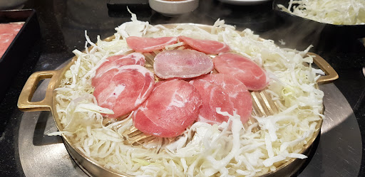 พอมานั่งก็ได้รับเนื้อหมูสไลซ์มาสองถาด พร้อมกับกะหล่ำปลีสไลซ์ แน่นอนว่าโปรนี้อย่าเติมกะหล่ำบ่อย เดี๋ยวไม่คุ้ม 55555