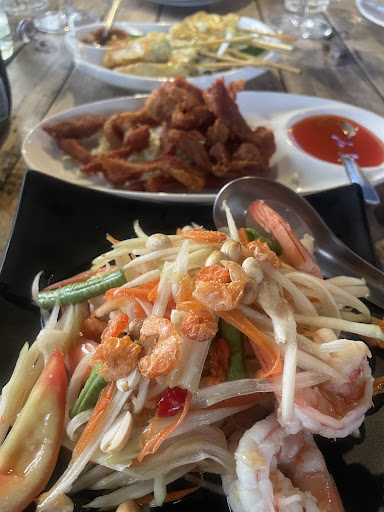 The restaurant opens daily from 8:00 to 19:00 so it is best to come early although late comers are still welcome but only with more simple dishes. We were four and took three starters: chicken satays ( bite size, very well seasoned), Somtam Thai (very nice too) and fried sun-dried pork. We ordered a Mapu red wine which was not bad. Main courses were Black rice (Riceberry), Tom Yam Kung (rather good), pork stir-fried with ginger (super good for ginger lovers), chicken cashew nuts (medium good). Followed by ice cream and banana (Kluay Kai) in coconut cream which was superb. The service was impeccable. Atmosphere was pleasant with the view to the lake. We enjoyed our time here very much and can highly recommend the place. We...