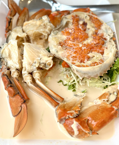 The prawn yellow curry is a delightful dish, but it lacks the spicy kick that is characteristic of traditional Thai curries. The crab is steamed with milk and served with a generous amount of crab roe, but the size of the crabs is quite small. It pairs well with the seafood sauce.