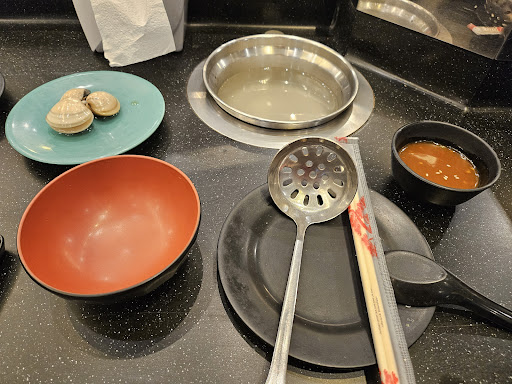 Unlimited food at 400 baht. The hotpot ingredients move on a belt, so you can take whatever you want. There are also cooked food such as fried chicken, fish, fried gyoza, rice and sushi. Unfortunately, the cooked food section was messy with sauce dripping everywhere and they did not restock it fast enough, most of it are...