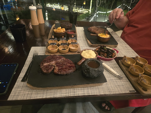 SLOW SERVICE!! No one welcomed us at the front, we had to walk in and grab the menus and seat ourselves… which was wild. Usually water is given right away and customers are asked right away if they’d like anything else to drink, we already looked at them menu and decided everything we wanted to eat and kept looking around for someone to take our order… waited minutes until someone finally came around. SUPER UNDERSTAFFED on a Friday night! Singha beer is reasonably priced. The complimentary small avocado/salmon bite was not bad but TINY, the complimentary bread was warm and fresh and came with soft butter and some salt. The Australian Wagyu beef tartare was soft and not too salty and comes with a bit of raw onion and slightly sauced arugula, bread could’ve been a bit more buttered/toasted. My husband and I both got the Black Angus Rib Eye steak, medium rare. The medium rare was good, steak was tender and soft/chewy, my steak had a stringy/tough fat line though so I couldn’t finish all the meat. The 3 sauces/salts helped add more flavor profiles. Sides were basic, I got fries w/ ketchup and the mushroom sauce and my husband got the mashed potatoes with peppercorn sauce. Mushroom sauce was not bad, tad salty but had a few thin slices of actual mushroom. We came with a friend, the men got their food first but mine came awhile later. I told them to eat first without me or else their food would have gotten cold. Waited another while for our dirty dishes to be taken away. We couldn’t get anyone’s attention for the check, it was late and we were tired. We figured we had given them our room number before we ordered so we thought they would just charge our room so we got up and left. We had already gone back up to our hotel rooms and 10 min later they must have finally noticed we were gone and someone came knocking on our door to ask for the check, and tip! We were appalled, they don’t deserve any! My husband was nice and forgiving enough to give 10%, Overall experience was meh, may or may not try this place again during our stay...