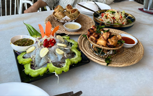 อาหาร กุ้งแช่น้ำปลา : รสชาติน้ำปลาไม่เด่นมาก ไม่ค่อยมีกลิ่นน้ำปลาสักเท่าไหร่ เน้นไปที่การจิ้มน้ำจิ้มซีฟู้ดแล้วทานมากกว่า กุ้งมีความสด นุ่มลิ้น ไม่เด้งดึ๋งแบบกุ้งสุก ตัวกระเทียมหั่นมาค่อนข้างชิ้นใหญ่ มีมะระมาแกล้ม น้ำจิ้มซีฟู้ดโอเค ทานง่าย
