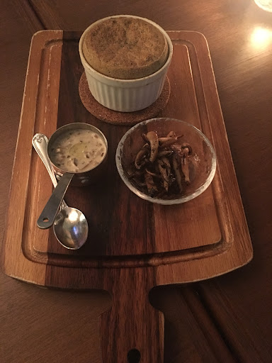 • Truffle Soufflé with Mushroom Cream Sauce เป็นซูเฟลแบบคาวที่ทางร้านเสิร์ฟซูเฟลเห็ดทรัฟเฟิลร้อนๆเนื้อนุ่มฟูดีต่อใจมาให้เอ็นจอยคู่กับครีมซอสเห็ดที่มีเนื้อเห็ดฉ่ำๆให้เคี้ยวกรุบๆเคล้ากับซอสนัวๆมันๆได้อย่างลงตัวไม่มีเลี่ยนเลย