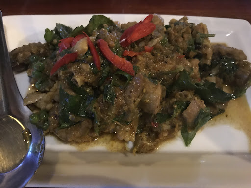 Read moreเรามาถึงที่ร้านประมาณหกโมงเย็นของวันฟ้าครึ้มก็เลยมีความรู้สึกว่าถ้ามาช่วงกลางวันจะทำให้บรรยากาศดูสดใสกว่า อาหารจานแรกที่สั่งเป็นอาหารแนะนำอันดับหนึ่งคือ ไก่บ้านผัดใบรา จานต่อมาคือปลาหมึกต้มกะทิใบส้มป่อยซึ่งไม่เห็นใครทำ ต่อด้วยอาหารยืนพื้นคือใบเหลืองผัดไข่ อาหารแนะนำอีกอย่างคือหมูคั่วเค็ม และสุดท้ายคือน้ำพริกระกำ พอสั่งเสร็จก็เริ่มได้ยินเสียงโขลกเครื่องแกง โขลกน้ำพริก พออาหารมา ชิมแล้วพบว่าดี ไก่บ้านผัดใบราหอมกลิ่นเครื่องแกงและใบยี่หร่า น้ำพริกระกำกินคู่กับหมูคั่วเข้ากันดี แต่ถ้ากินไก่ผัดใบราแล้วตามด้วยน้ำพริกระกำจะเผ็ดสุดๆ เผ็ดไปทุกส่วนในปาก จนต้องมาหาใบเหลียงผัดไข่ที่รสชาดนุ่มนวลช่วย อีกอย่างที่ช่วยแก้เผ็ดได้ดีคือปลาหมึกต้มใบส้มป่อย ที่ใช้ปลาหมึกไข่ตัวไม่ใหญ่ต้มกับน้ำกะทิใส่ใบส้มป่อยทำให้น้ำมีรสคล้ายๆต้มกะทิสายบัวหวานนิดๆแต่มีความเปรี้ยวอ่อนๆของใบส้มป่อยมาทำให้รู้สึกสดชื่นเมื่อซดน้ำ