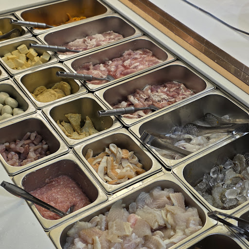 วัตถุดิบดูสะอาดสะอ้าน น่าทาน เวลาของพร่องพนักงานจะพยายามเติมตลอด อาจมีช้าบ้างแต่ไม่ช้ามาก นอกจากไลน์บุฟเฟ่ต์ที่วางไว้บนโต๊ะกลางตัวใหญ่แล้ว ในตู้เย็นจะมีเนื้อหมูกับเนื้อวัวสไลด์ใส่ถาดไว้ให้ พนักงานจะแจ้งให้ลูกค้าทราบว่าถาดสีแดงจะเป็นเนื้อหมู (สามชั้น สันคอ สันนอก) ส่วนถาดสีขาวจะเป็นเนื้อวัว