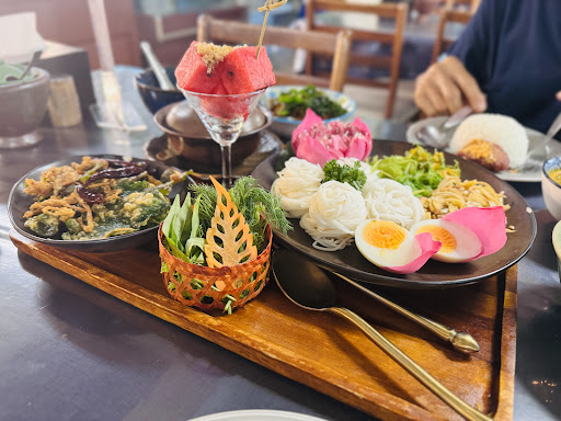 The menu is filled with exceptional dishes, but the standout is the rice noodle in sweet coconut curry sauce (ขนมจีนน้ำพริก), served in a beautifully arranged set with fresh banana blossoms, lotus flowers, and fried vegetables, finishing with the traditional Thai snack of dried fish and watermelon (ปลาแห้งแตงโม). This set is perfect for sharing between two to three people.