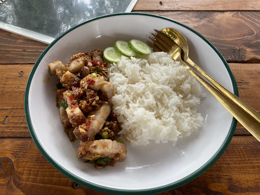 ดุดันไม่เกรงใจใคร! หมูกรอบ หนังกรอบ เนื้อนุ่ม มันฉ่ำ คั่วกับพริก ราดข้าว เป็น ‘ข้าวหมูกรอบพริกเกลือ’ เผ็ดร้อน ตัดด้วยความเปรี้ยวของน้ำจิ้มพริกเขียว ตักกินพร้อมกับข้าวทีละคำๆ ตอนแรกคิดว่าจะตัดข้าวออกครึ่งหนึ่ง แต่รสจัดจ้าน ตักข้าวกินจนเกลี้ยงจานพอดี (ส่วนตัวชอบข้าวที่หุงขึ้นเป็นเม็ดแบบนี้ ไม่แฉะ ไม่แข็ง) • อีกเมนูสั่งกลับบ้านคือ ข้าวหมูสามชั้นย่างเตาถ่าน เหมือนจะไม่มีในเมนู (มีหมูกรอบ หมูตุ๋น หมูแดดเดียว ขาหมู หมูสับ เนื้อตุ๋น เนื้อสับ) แต่เห็นรูปในเพจเฟสบุ๊คแล้วน่ากิน อดใจไม่ไหว • ร้านเปิดโล่ง หลังคามุงจาก อากาศไม่ร้อนมาก ที่จอดรถเลี้ยวเข้ามาจอดข้างร้านด้านใน •...