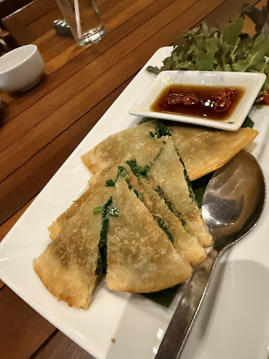For food, we ordered several Thai classics. The grilled fish chili paste ((Nam Prik Pla Yang) was smoky, rich, and paired wonderfully with fresh vegetables. The Tom Yum Goong was spicy, sour, and aromatic — exactly how it should be. The pineapple fried rice, served inside a real pineapple, was both fragrant and comforting. And our favorite of the night was the deep-fried sea bass with sweet fish sauce, topped with a tangy green mango salad — crispy, flavorful, and super satisfying.