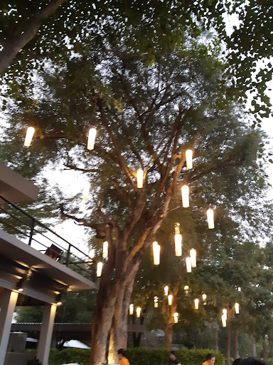 They have a live band who plays soft pop music and love songs. You sit outside along the river. They have many fans for your needs, but there is a steady breeze from the river and we didn't have any problems with bugs. They hang lights on the trees but kept it dim and cozy.