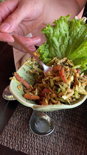 Great spot with excellent service. Everything is made fresh to order and the servers are very kind. The Tom yum stir fry was my favorite - one of the women who works there recommended it and it was surprisingly good. One of the best dishes I’ve had in Thailand. It wasn’t sweet, but had some spice and lots of flavor. I only wish they gave you a bigger portion! The spring rolls were a miss - seemed like two big spring rolls deep fried a second or third time and then cut up. Mostly inedible. The tofu with green beans (tofu green pepper stir fry) was also excellent. I don’t remember the name but the soy curls with green beans was not great. It was very, very salty and hard to finish. We also ordered the spaghetti pomodoro, which is not something we usually do unless the place specializes in it, and it was unsurprisingly underwhelming. It tasted like tomatoes with chili flakes but no salt at all, and the noodles were very watery. Another star dish was the Burmese tea leaf salad. We’d had it before at another vegan restaurant in Thailand and this one was just as good! Absolutely delicious.