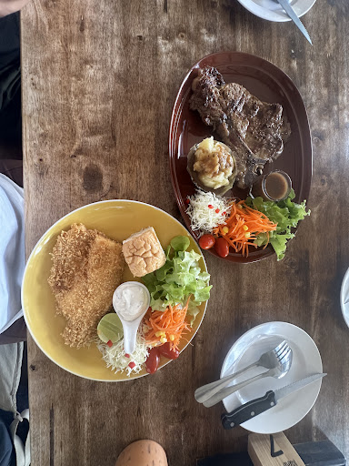 Price was very reasonable and the portions good. (June 1, 2023 -- 610 baht [about 20 bucks, U.S.] got us the Steak and Fish meals, plus extra French Fries, an order of Cheesy Garlic Bread, and a Ceasar Salad that we shared.